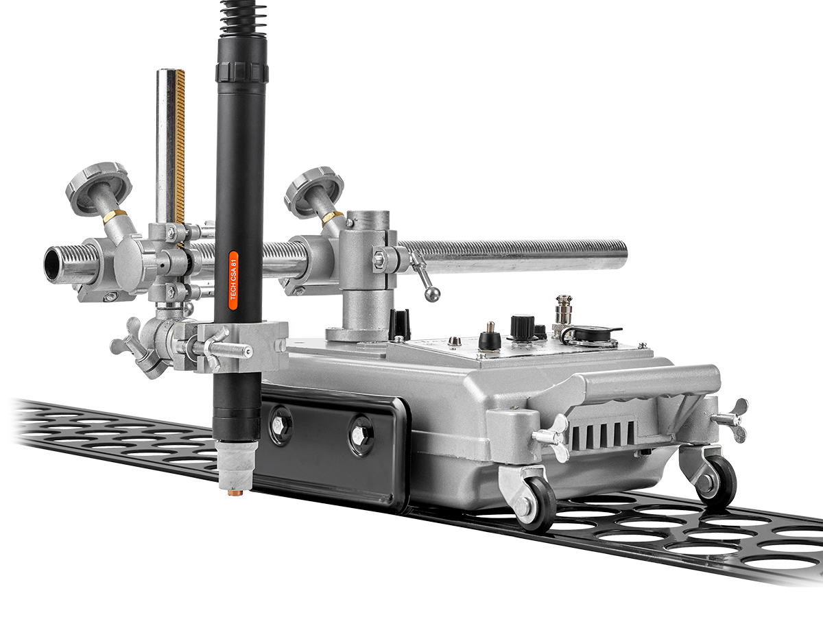Работа выполняется плазменным резаком, установленным в держателе на самоходной тележке. Зажим крепления резака для машин термической резки имеет реечный механизм, который позволяет перемещать резак, регулировать его высоту установки над поверхностью металла, а также устанавливать угол наклона резака в пределах ±45°. Для фиксации резака предусмотрены винты.