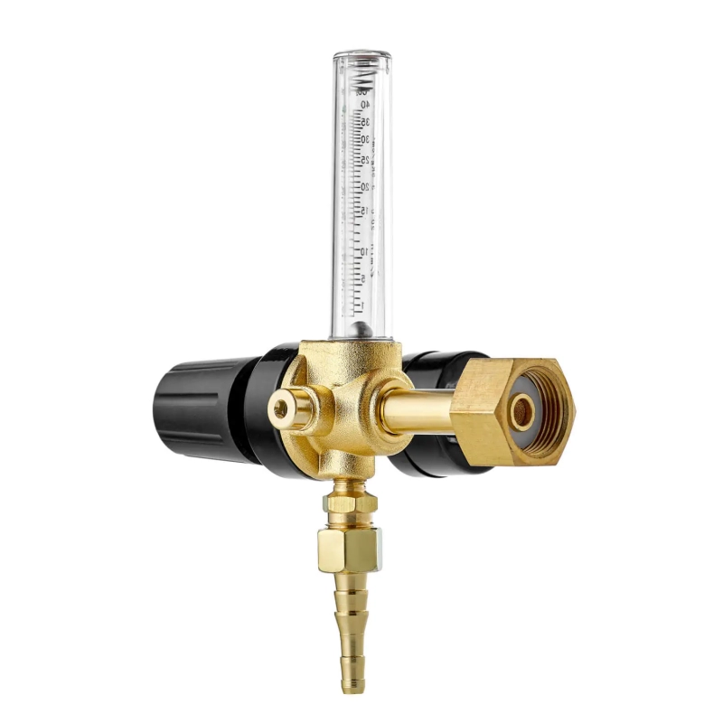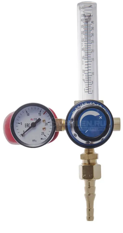 Колба ротаметра изготовлена из прочного пластика, которая имеет две шкалы Ar/CO2. На регулятор установлен эргономичный винт из металлопластика.