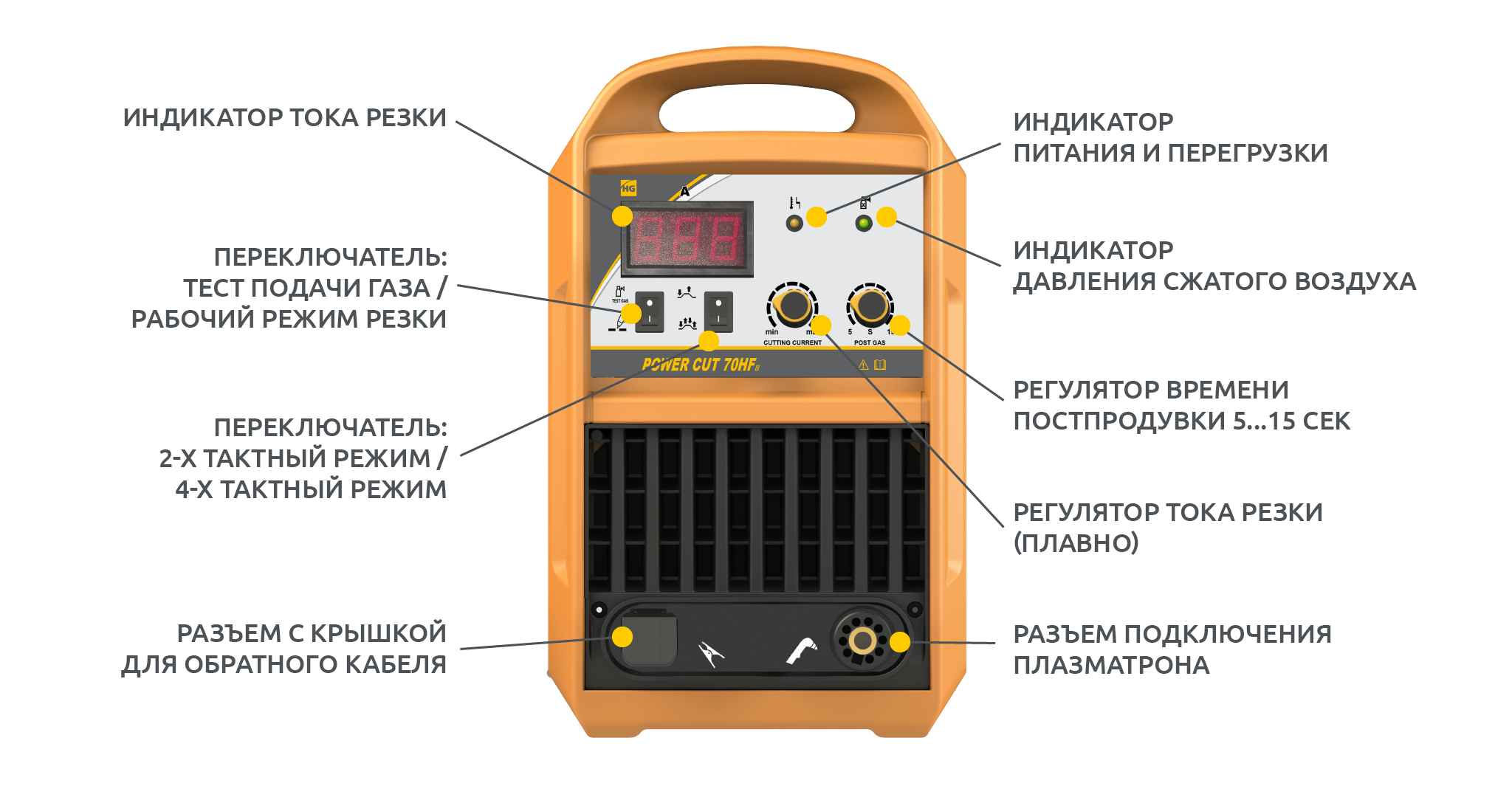 - Аппарат воздушно-плазменной резки HUGONG POWER CUT 70 HF III разработан и изготовлен по инверторной технологии на базе новейших IGBT транзисторов, благодаря чему имеет высокие показатели по КПД преобразования электрической энергии, малый вес и высокую надежность.