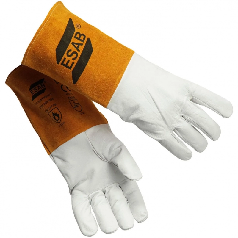 Перчатки TIG SuperSoft от производителя ESAB - эксклюзивные, исключительно мягкие сварочные перчатки, которые изготовлены из высококачественной овечьей кожи. Швы прошиты кевларом. Прямой большой палец облегчает захват различных объектов. Кожаные манжеты длиной 13 см. Указательный палец бесшовный для улучшения гибкости.