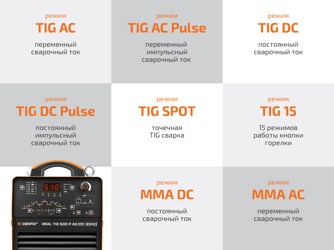 - Выбор параметров сварки: ток, баланс полярности, 2Т и 4Т режимы сварки, режимы сварочной горелки, память программ сварки