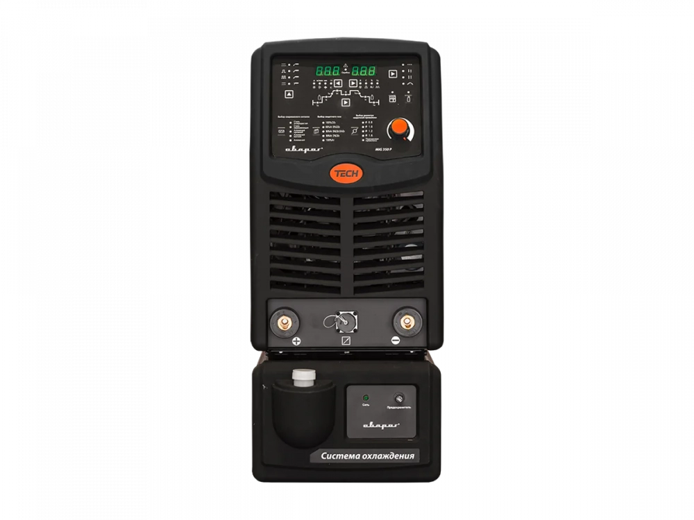 TECH MIG 350 P (N316) состоит из выносного подающего механизма, источника питания и блока жидкостного охлаждения. Все оборудование располагается на удобной тележке с площадкой для крепления баллона. Панель подающего механизма оснащена индикаторами тока и напряжения. На блоке кулера расположен индикатор уровня жидкости, а подключение блока производится без дополнительных проводов.