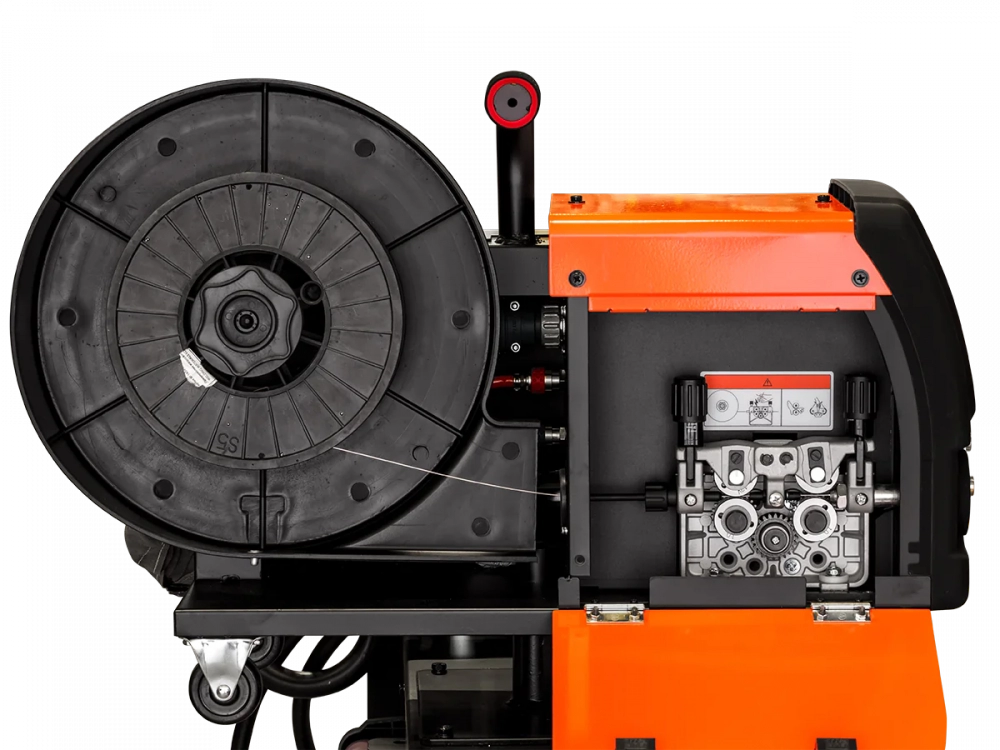 - Блочная система на прочной тележке: источник сварочного тока, подающее устройство и теплообменник